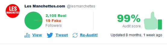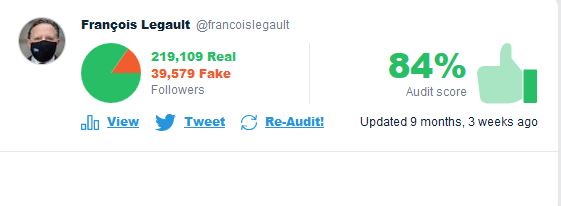 Sur l'application Twitteraudit pour voir combien de vos abonnés sont réels, @François Legault récolte près de 40 000 de faux abonnés (fake) pour celui qui à développé l'application cela semble acceptable, pour ma part c'est énorme. On ne peut pas savoir qui partage réellement ses idées, s'ils sont en accord ou s'ils sont là que pour faire avancer ses décisions.