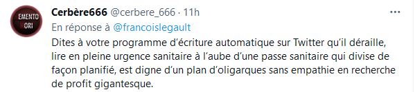 - Entretenir ma curiosité, «ben ça tombe très bien! au début j'ai été un des premiers à vous croire, durant trois semaines à mettre du purel, me laver les mains, même laver mon panier d'épicerie.» »Enfin, ma curiosité m'a fait regarder ailleurs que les sondages et médias traditionnels que vous financer, vous payez à l'aide de nombreuses pubs gouvernementales.» «Je me suis rendu compte que les chiffres sont biaisés, vous mentez, encore on le voit aujourd'hui votre Passe sanitaire repose sur aucun chiffre réel.»