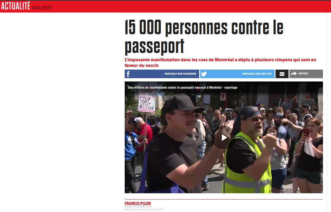 Fake News, Le Journal de Montréal. Hier en après-midi une ’imposante manifestation dans les rues de Montréal contre le passeport vaccinal au Québec.