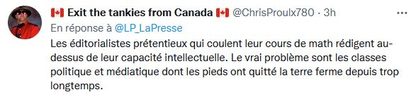 Il vient juste de signé un nouvel article, de toute splendeur : "Les radicalisés" les commentaires étaient tellement mauvais à son endroit que j'ai été curieux et je l'ai lu, wow comme dénigrement il n'y a pas mieux! En fait il commence par dire que les gens qui avait pris part à une manifestation était radicalisés et de l'extrême droite, sans toute fois expliquée pourquoi les gens sont si fâchés contre Justin Trudeau.