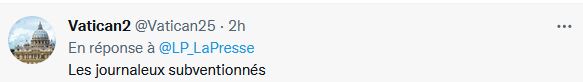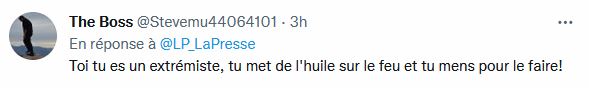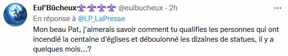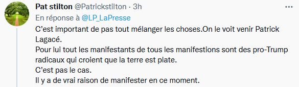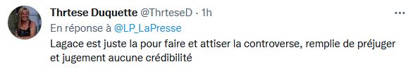 «Patrick devrait relire le code éthique du journalisme, La Presse aussi, Lagacé toujours aussi méprisant et condescendant, désinformation, Inondons La Presse de plaintes pour manque d’éthique journalistique, a quoi sert Patrick lagacé, a un sérieux problème là! Il est complètement incohérent , discours haineux, langues brunes du Québec, Patrick Lagaçé, quand un hystérique est dans sa phase extrême de délire, quand est-ce qu'on arrête Jean Charest Guy Ouellet et Patrick Lagacé ?