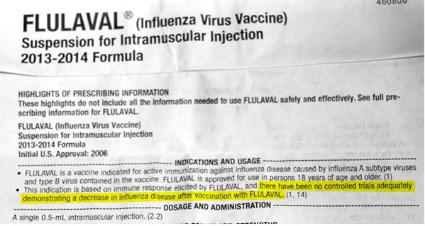 Exemple concret ? Cette fiche d'insertion du vaccin contre la grippe Flulaval, qui admet ouvertement, "... il n'y a eu aucun essai contrôlé démontrant de manière adéquate une diminution de la maladie grippale après la vaccination avec FLULAVAL."