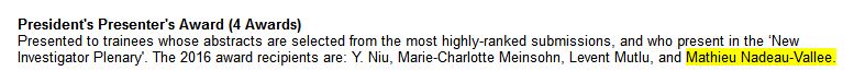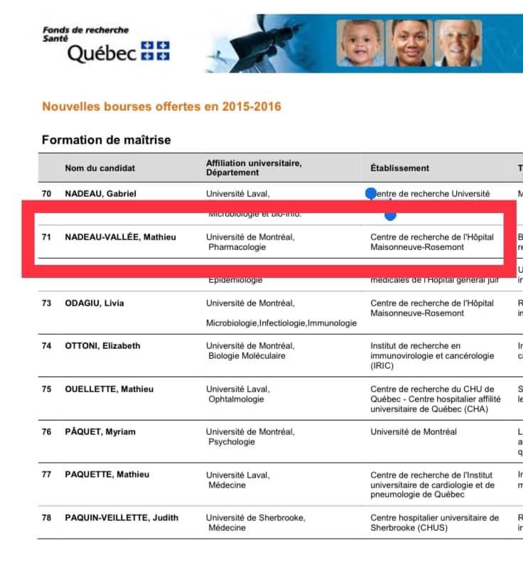 Ensuite, il a reçu une bourse du Fonds de recherche en Santé (FRS) du gouvernement du Québec pour son projet de maitrise en 2015-2016.