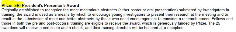 Deuxièmement en 2016 il a reçu un prix SRI de « Annual scientific meeting » et c’est Pfizer qui finance les montants en argent de ces 25 awards.