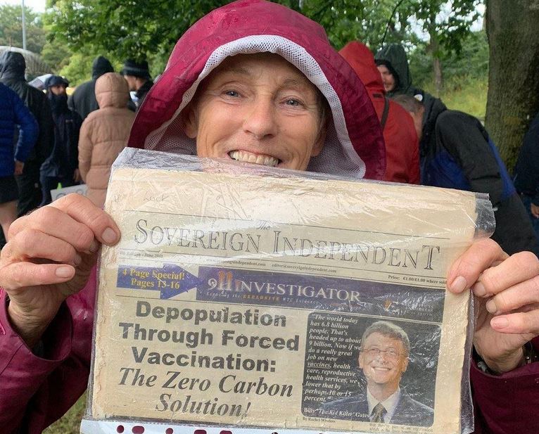 Ici l'exemple parfait de la corruption médiatique de Reuters, ce média explique que cette dame à en main la copie d'un journal Sovereign Independent, elle reprend les paroles de Bill Gâte, qui explique lors d'une conférence, il faudrait vacciner de force pour dépopuler la planète: la solution zéro carbone !