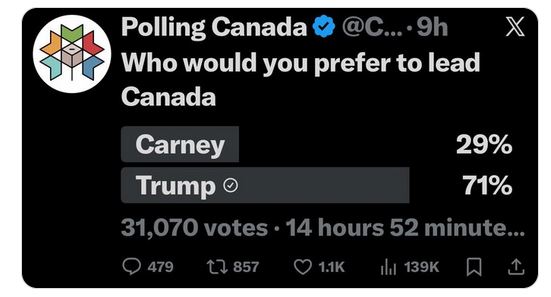 Voici un sondage assez représentatif, la firme de sondage Polling Canada à mise un sondage en ligne : Qui verrez vous comme premier ministre au Canada, Carney ou Trump et devinez qui la remporté ? Trump là rempoté avec 71% sur 31,000 répondants, 22 000 personnes ont votés TRUMP.