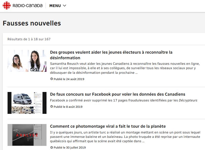 Avant toute chose, il faut dire que Radio-Canada a trouvé un budget pour deux journalistes enquêteurs de fausses nouvelles, un budget dans les poches des contribuables pour dénoncer les Fakes News, un menu "catégorie" fausses nouvelles est maintenant active depuis 15 septembre 2017, sur le site web du diffuseur.