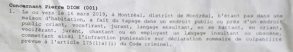 1. Le ou vers le 16 mars 2019, à Montréal, district de Montréal, n'étant pas dans une maison d'habitation, a fait du tapage dans un endroit public ou près d'un endroit public criant, vocefirant, jurant, langage insultant, en se battant, en criant, vociférant, jurant, chantant ou en employant un langage insultant ou obscène, commettant ainsi l'infraction punissable sur déclaration sommaire de culpabilité prévue à l'article 175(1) a)(i) du code criminel.