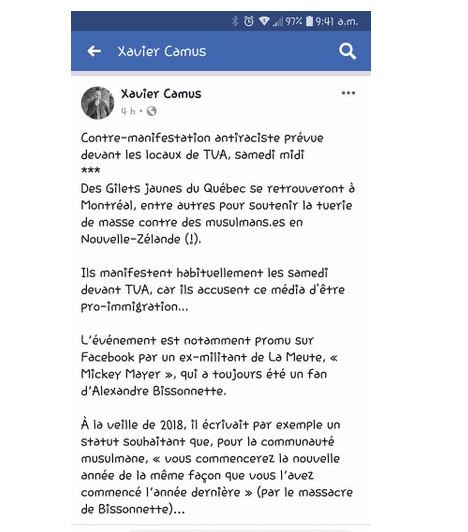 La preuve est démontrée que le mouvement jaune a été dérangé par un appel à la haine de Xavier Camus, le père des Antifas de Montréal, sur sa page Facebook, ce menteur né, à inventé une histoire en disant que les gilets jaunes allaient manifesté devant TVA pour soutenir la tuerie de masse contre les musulmans en Nouvelle-Zélande. Voilà exactement la raison de la présence des policiers.