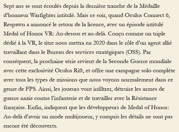 Voici ci-dessus l'article de ZT-PROTECT : Comeback annonce Medal of Honor: Au-delà de VR et vidéo