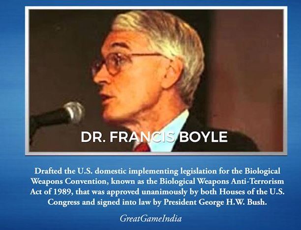 Hélas, il semble bien que mon questionnement ait trouvé sa réponse : Tribune International rapporte les propos du Dr américain Francis Boyle, professeur de droit international à l’université de l’Illinois College of Law, celui-là même qui a rédigé aux États- Unis la loi sur les armes biologiques sous le nom de Loi sur la lutte contre le terrorisme des armes biologiques de 1989 à l’époque de Bush, une loi adoptée par les deux chambres du Congrès et signée par le Président américain.