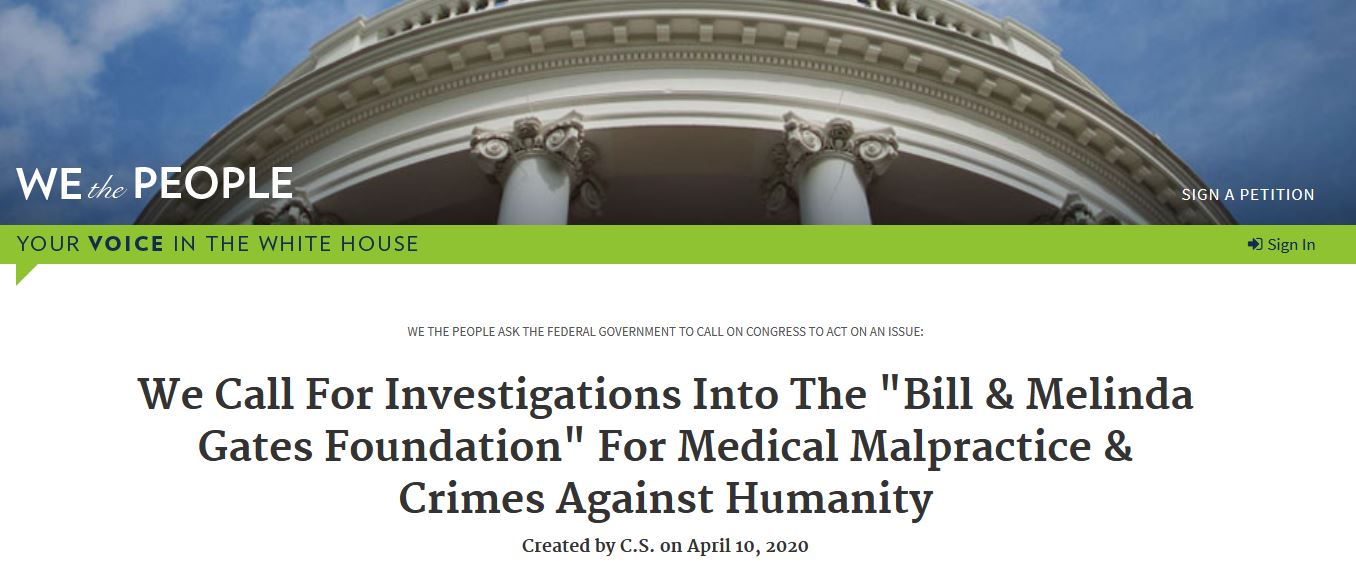 La pétition lancée le 10 avril dernier a pour but d'ouvrir une enquête sur la "Fondation Bill & Melinda Gates" pour faute professionnelle médicale et crimes contre l'humanité.