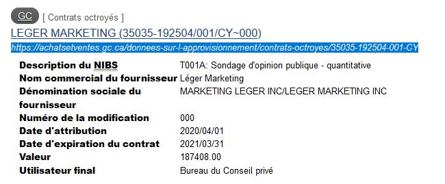 Le gouvernement du Canada à attribuer à Leger un contrat le 2020/04/01 au montant de 187 408,00 $. http://lesmanchettes.com/les-petites-vites/1380-les-sondages-leger-achetes-par-le-gouvernement-du-canada