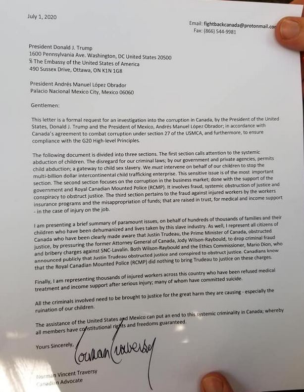 La question se pose : risque-t-il d'être arrêté aux États-Unis sachant que le premier juillet dernier lors d'un rassemblement à Ottawa, un pompier de Montréal, Normand Vincent Traversy à déposé un document rédigé par un avocat demandant à Donald Trump et Andrés Manuel Lopez Obrador président du Mexique d'enquêter sur Justin Trudeau sur la corruption, enlèvement d'enfants, maltraitance, gouvernement du Canada et de la Gendarmerie royale du Canada (GRC).