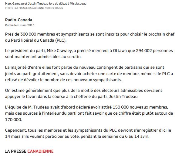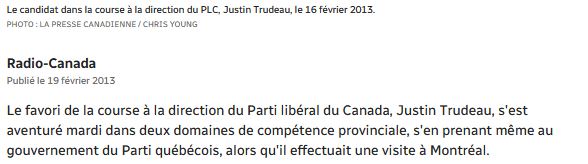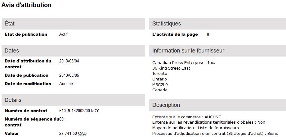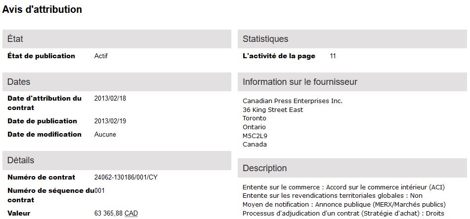 Le premier contrat attribué à La Presse Canadienne. Voici maintenant ce qui est sortie de La Presse Canadienne une journée plus tard, soit le 19 février 2013 :