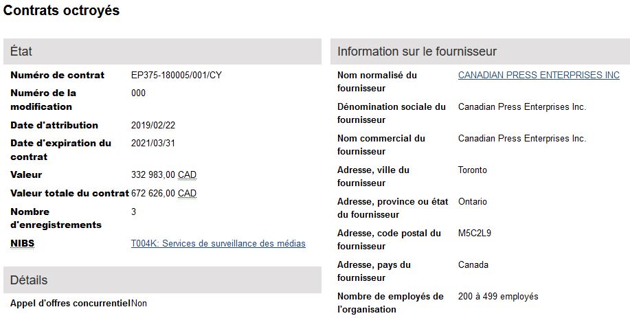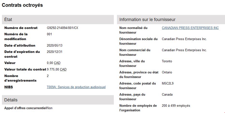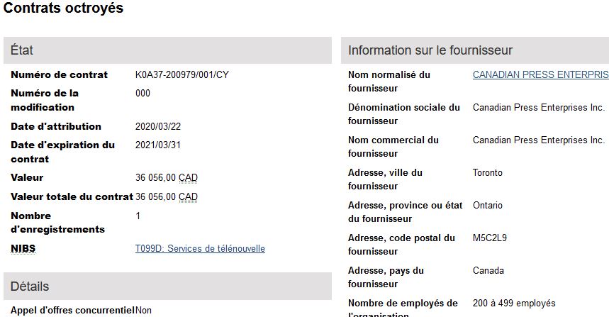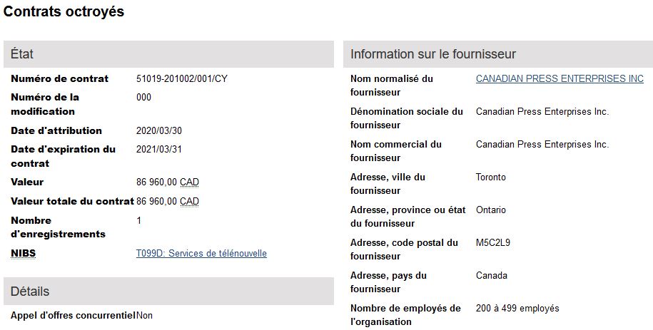Le dernier contrat visible octroyé à La Presse Canadienne