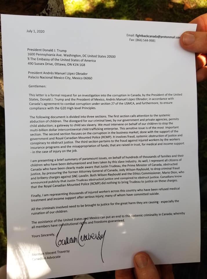Mais encore, les médias vous ont aussi caché qu'il y a eu un document remis à l'ambassade, ce document, demande à Donald Trump et le président du Mexique d'enquêter sur JustinTrudeau.