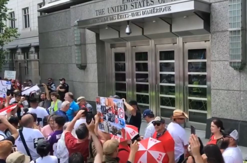 Des milliers de personnes à l'ambassade américaine réclament la démission de Trudeau
