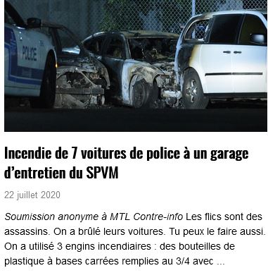 Il nous dit que c'est des anarchistes, pour bien du monde, ça ne signifie pas grand-chose, mais si le titre avait été «Les antifas de Montréal ont revendiqués l'incendie de 7 voitures de police», voilà, on aurait compris qu'on avait affaire à un groupe terroriste qui terrorise le monde, qui s'adonne à la violence et qui s'attaque à tout le monde qui n'adhère pas à leur idéologie.