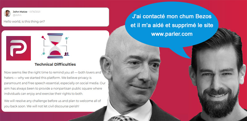 Quand Jack à appris que le site internet Parler.com faisait de l'ombrage à Twitter et que le président Trump avait un compte, Jack à contacté son ami Jeff Bezos d'Amazon, «qui s'est fait prendre à commercialisé l'année passée des poupées représentant des enfants pour le monde de la pédophilie», «les médias ont gardé le silence, on ne sait pourquoi ?» il ne s'est pas gêné pour lui demandé de l'aide et faire fermé le site Parler.com