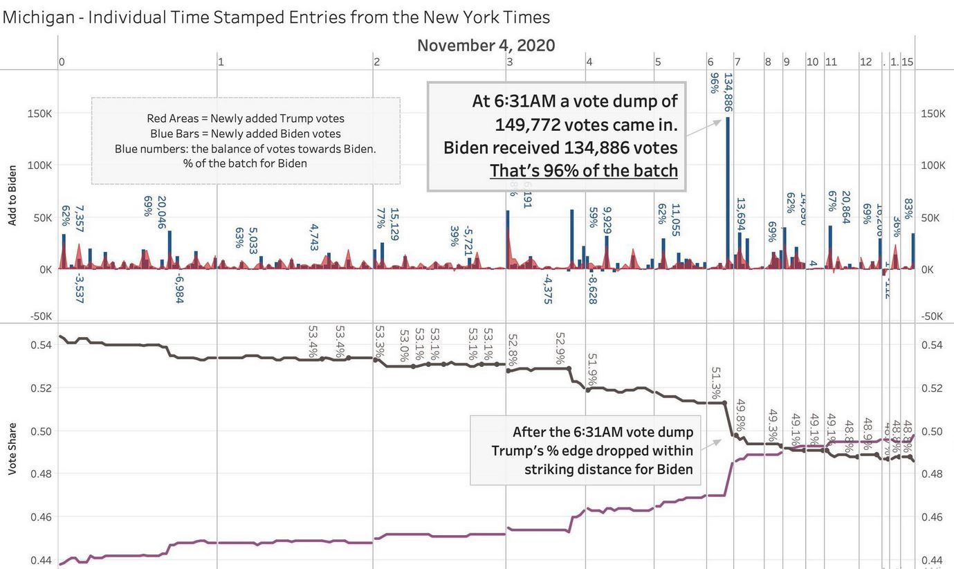 Regardez bien le tableau de Michigan ci-dessous en rouge, Trump en avance avec 51.3% et Joe Biden, à 6h31 am reçoit d'une shot 134,886 votes et juste après 6h31 am on peut voir dans l'autre tableau Trump droppe immédiatement.