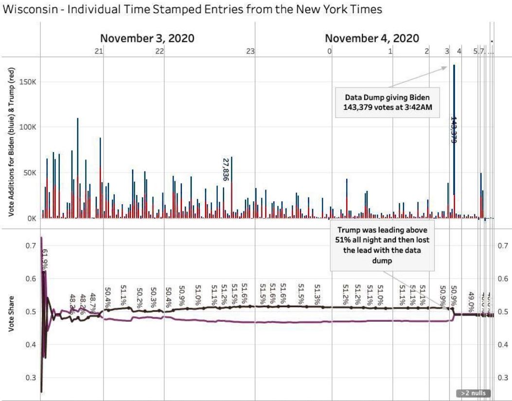 Same thing for Wisconsin, Trump ahead 51%, Joe Biden receives at 3:42 am 143,379 votes.