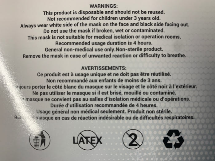 Pour finir, le gouvernement accepte ce genre de masque, pourquoi, pourtant c'est écrit noir sur blanc sur les boites que c'est inutile! Au moins s'ils étaient faits contre les virus, je pourrais comprendre qu'on ne veut juste notre bien, qu'on à notre santé à coeur.