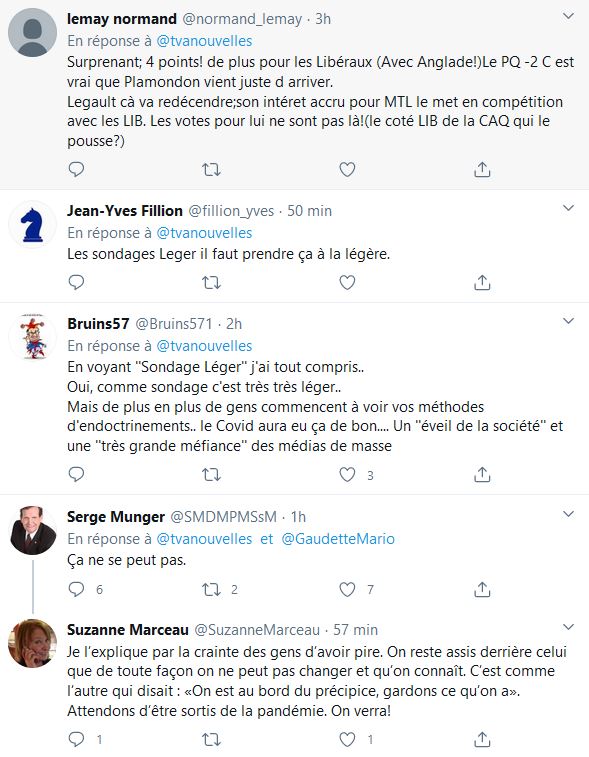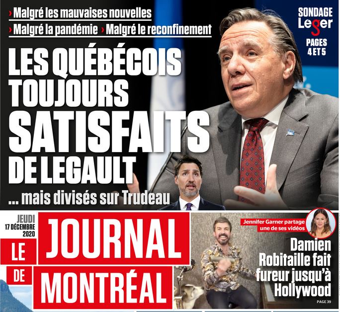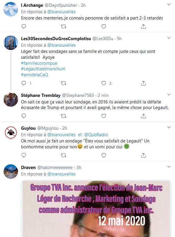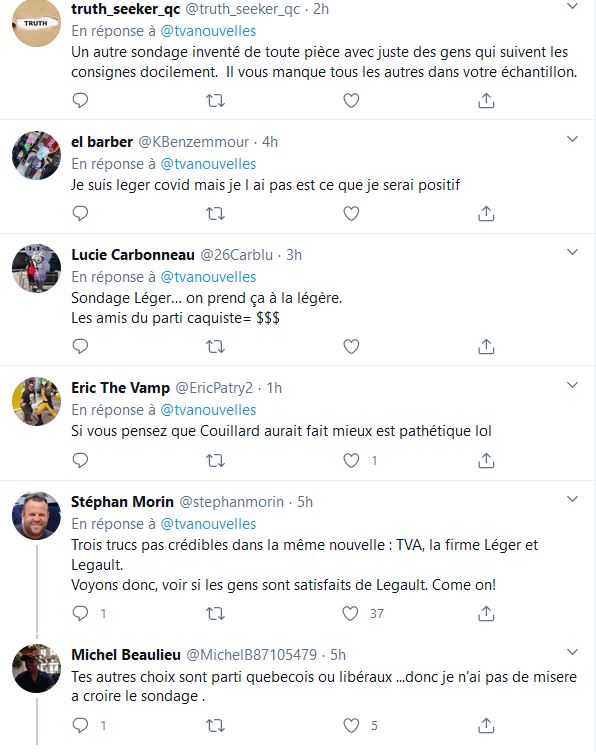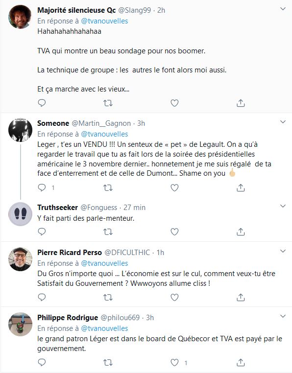 Avec Jean-Marc leger quand ce n’est pas un, c'est l'autre, soit Legault et Trudeau, pour les gens qui ne le savaient pas encore, l'entreprise Leger reçoit des millions pour favoriser les gouvernements, Leger , le beurre et le pain sur la table M Leger vient presque principalement des gouvernements.