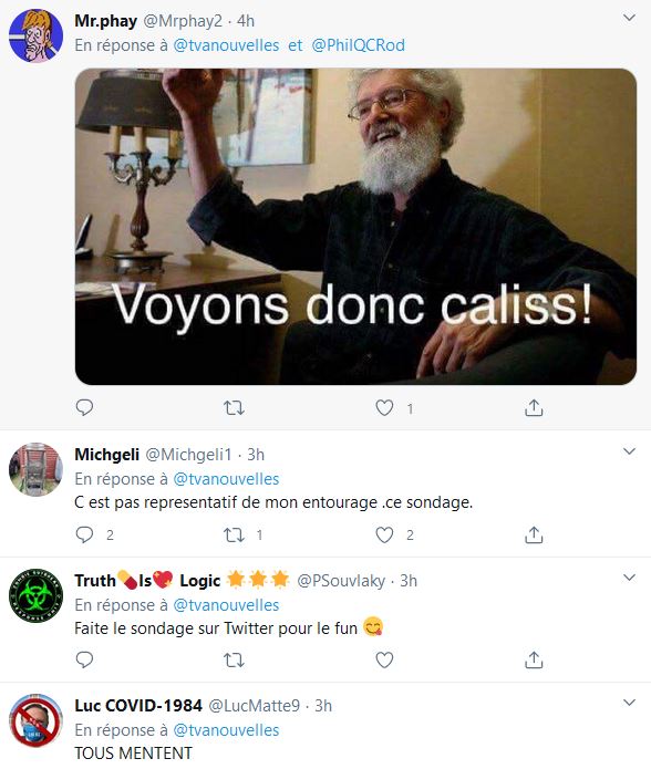 Évidement, quand Jean-Marc Leger fait des sondages de ce genre, c'est surtout pour les gens à la maison qui en on rien à faire que la crisse du Covid soit réel ou non, ils s'en foutent éperdument, ils se disent respectons la loi, la loi c'est la loi, les vrais petits citoyens modèles qui tentent chaque année de sauver de l'impôt en trichant et en se faisant croire qu'ils sont honnêtes.