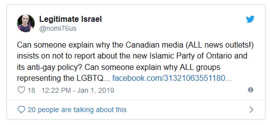 «Quelqu'un peut-il expliquer pourquoi les médias canadiens (TOUS les médias!) Insistent pour ne pas parler du nouveau Parti islamique de l'Ontario et de sa politique anti-homosexuelle? Quelqu'un peut-il expliquer pourquoi TOUS les groupes représentant les LGBTQ… »