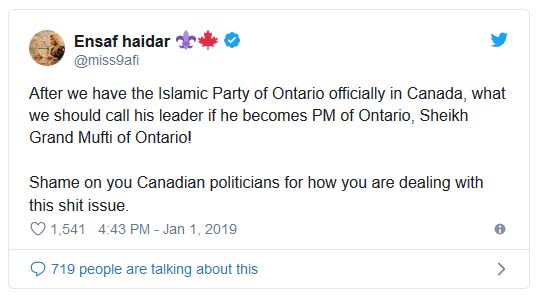 «Le véritable ennemi du Canada est celui qui fait la promotion de la charia et crée un parti islamique basé sur la charia dans un pays libre!»