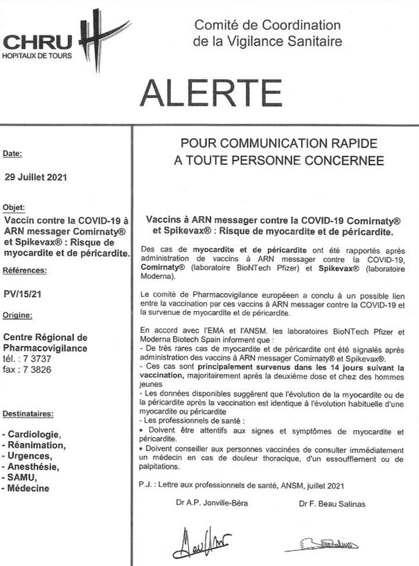 Des rapports internationaux de myocardite et de péricardite après l'administration du vaccin à ARNm contre la COVID-19 sont apparus, c'est pas comme si on le savait pas!