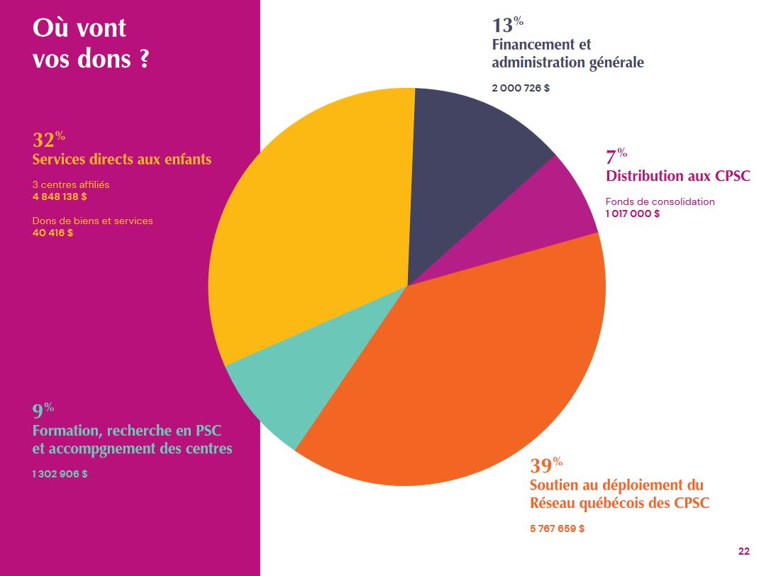 En 2016 la fondation à fait 4 741 708 - les dépenses de 3 387 047, reste 1354 661, sur ce montant est déduit une réserve de sécurité, pour continuité des services,  exemple : éventualité, pérennité, services au enfants, combien pour les enfants ?