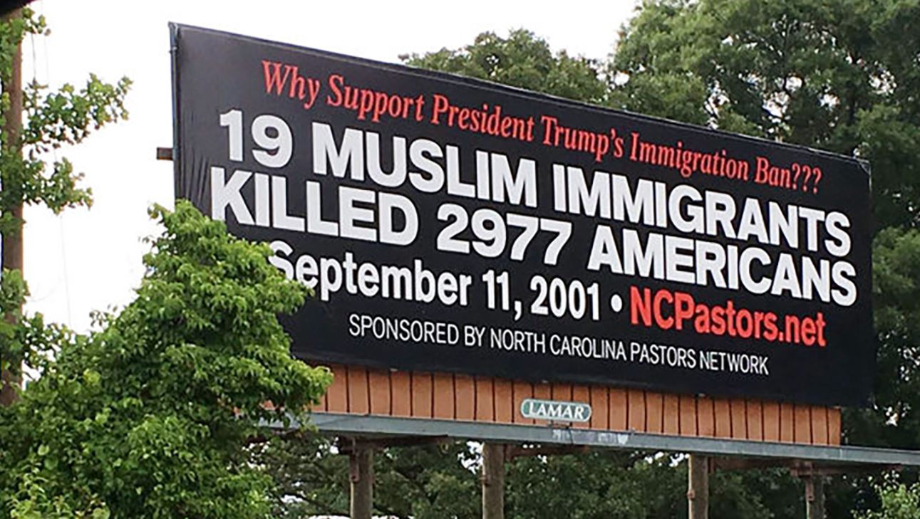 Le panneau d'affichage, financé par le North Carolina Pastors Network, indique les attentats terroristes du 11 septembre et leurs auteurs.