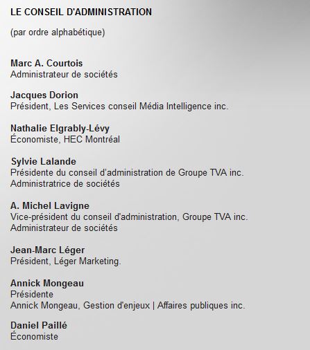 En, plus l'exemple parfait que je peux vous donner pour illustré l'indécence de cette firme de sondages, Jean-Marc Léger est sur le C.A. de Groupe TVA à la rescousse de ces grands médias.