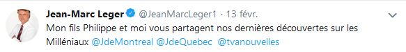 Nous savons que Jean-Marc Léger est très proche de ce média, je dirais même plus, dernièrement on a engagé un jeune au Journal de Montréal pour nous donner le point de vue des millénaux «apparemment il est unique». C'est son fils qui a eu le poste. Ça a adonné de même, pas de pushing.