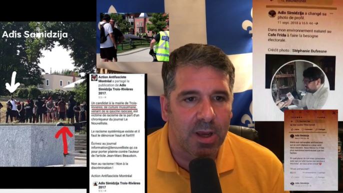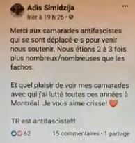 Je sais pas si Gabrielle Cossette se sent un peu innocente maintenant avec ces centaines de dollars de dommages et si elle rend compte, mais Adis Simidzija QUI SEMBLE ÊTRE TRÈS PROCHE DES ANTIFASCISTES et il utilisait son resto à des fins politiques, bref tout le contraire de ce qu'elle raconte.