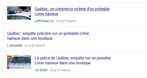 Bien oui, figurez-vous donc, qu'il y a eu un autre gros crime haineux à Québec, un commerçant a été pris pour cible avec du caca par un blanc raciste. (lexique préféré des médias)