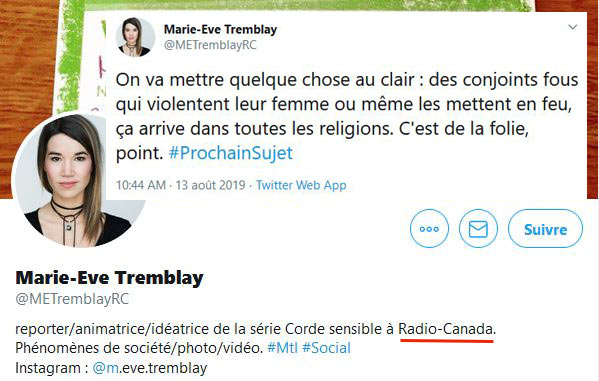 Quand je vous parle de donner moins d'importance à un crime, nous avons l'exemple parfait d'une journaliste de Radio-Canada qui a publié sans gêne sur son compte Twitter ce texte suivant :