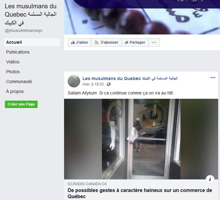 Il y a le fait de ne pas sortir publiquement, mais il y a aussi sur les réseaux sociaux les groupes musulmans qui dénoncent le caca dans une vitrine, mais ne dénoncent en rien l'attaque sauvage à Québec, exemple sur la page Facebook :