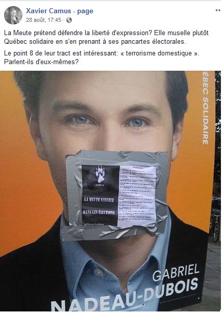 Réputé pour sans donner à coeur joie de jeter sa haine sur Parti Québécois. Maintenant il jette son fiel sur le groupe La Meute. Le 28 aout Cumus publiait sur Facebook une photo d'une affiche électoral de Québec Solidaire supposément vandalisé par La Meute, sans même savoir que ça aurait pu être un coup monté et accuse sans aucune preuve.