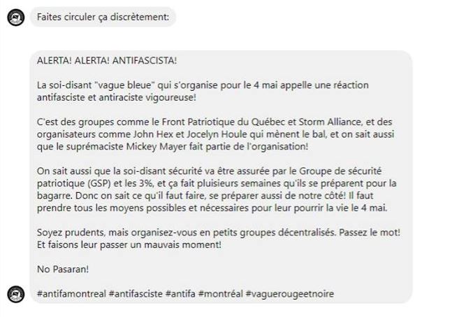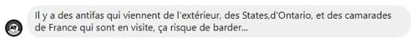 Voici le message d'Action Antifasciste Montréal qui a été lancé sur la page Facebook, ce n’est rien de moins qu'un massage clair de violence.
