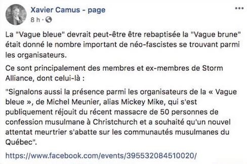 Depuis Xavier Camus tente par tous les moyens de faire de la merde avec la grande manifestation de la Vague Bleu samedi prochain le 4 mai, celui-ci à là même rebaptisé sur Facebook la Vague Brune.