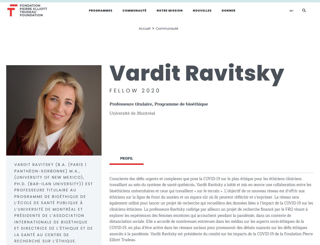 Mme Ravitsky ne siège, même pas sur le conseil d'administration de la Fondation Pierre-Élliotte Trudeau, Ravitsky est présidente du comité sur les impacts de la COVID-19 de la Fondation Pierre Elliott Trudeau, on comprend exactement pourquoi elle mentionne cela, surtout à La Presse Canadienne qui est financée par le bureau Trudeau !