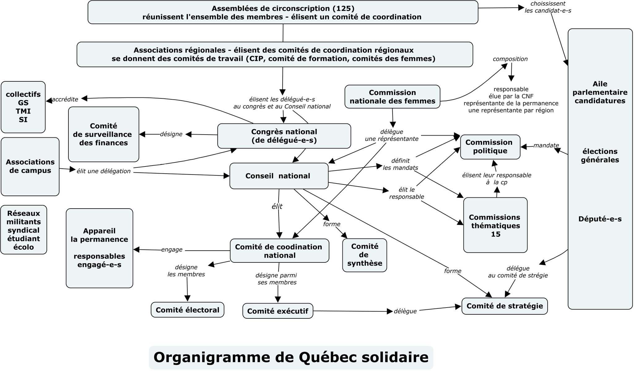 Voici l'organigramme de Québec solidaire: Ça ressemble à l'organigramme d'une entreprise qui cherche à brouiller les pistes afin de détourner de l'argent dans un paradis fiscal, imaginez maintenant l’organigramme du gouvernement si jamais Québec Solidaire formait prochain gouvernement.