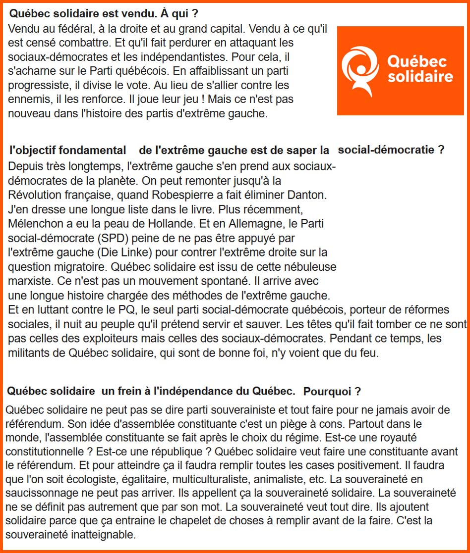 L'autre question que je me pose: Québec solidaire est-il un parti de gauche ou un parti d’extrême gauche, comme son chef ? QS est un parti d’extrême gauche qui rejette notre système « capitaliste » et qui exècre la social-démocratie à la québécoise.