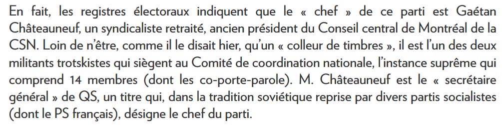 Supposons que Québec Solidaire rempoterait les élections, qui serait réellement à la tête comme ministre du Québec, est-ce Géatan Châteauneuf ? Probablement que oui, pourquoi ne revendiquerait-il pas son droit, pour ma part c'est évident qu'il occuperait des fonctions autres que petit secrétaire de Québec Solidaire.