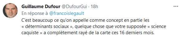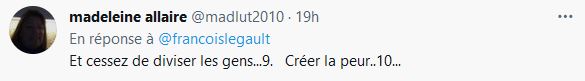 - Entretenir ma curiosité, «ben ça tombe très bien! au début j'ai été un des premiers à vous croire, durant trois semaines à mettre du purel, me laver les mains, même laver mon panier d'épicerie.» »Enfin, ma curiosité m'a fait regarder ailleurs que les sondages et médias traditionnels que vous financer, vous payez à l'aide de nombreuses pubs gouvernementales.» «Je me suis rendu compte que les chiffres sont biaisés, vous mentez, encore on le voit aujourd'hui votre Passe sanitaire repose sur aucun chiffre réel.»