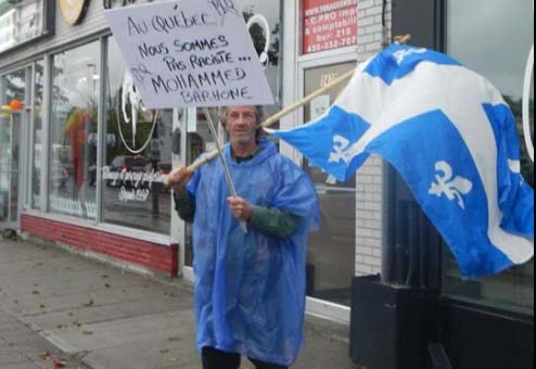 Manifestation de André Lavigueur devant le bureau du candidat libéral de Taillon Mohammed Barhone.