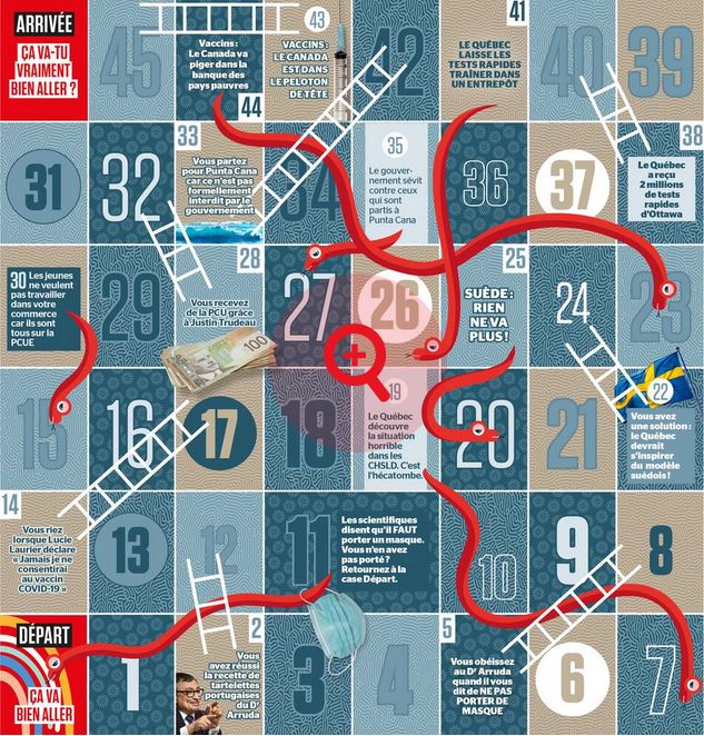Quoi de mieux pour résumer ce qui s’est passé qu’un jeu de Serpents et Échelles ? Deux mamans, Chloé Baillargeon et Zoé Boudreau, en ont déjà fait un. Voici ma version – plus caustique. Sortez les dés !